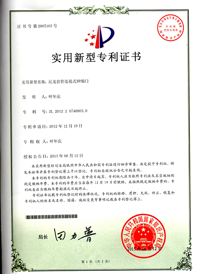平移門發明專利證書